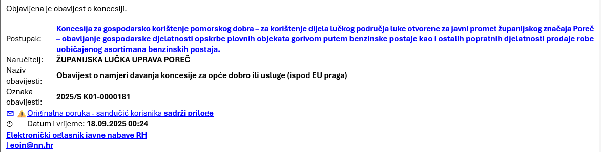 Koncesija za gospodarsko korištenje pomorskog dobra – za korištenje dijela lučkog područja luke otvorene za javni promet županijskog značaja Poreč